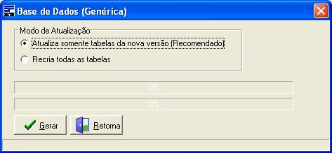 Recria todas as tabelas: Quando esta opção estiver marcada, o sistema fará a atualização de todas as tabelas do sistema, independente de versão. Esta rotina é útil quando da queda de energia ou travamento no servidor.